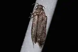 The wingspan is 13.5–14 mm. The forewings are dark fuscous, sprinkled with black scales in the middle and apical part of the wing. The scales near the base are minutely tipped with whitish. From the basal fourth of the costa an outwardly oblique pale fascia, narrowing toward the dorsum, reaches a little beyond the fold. It is bordered inwardly by a heavy line of black scales, which ends in a small patch of raised black and whitish scales just below the fold. There is also a small patch of raised black and white scales on the fold beyond the fascia and an indistinct pale spot in the middle of the costa, as well as an irregular transverse pale fascia at three-fourths concolorous with the oblique fascia, scarcely reaching the dorsum, and sending a short broad inward projection basalwards in the middle of the wing. At the inner edge of this projection is a small patch of raised black scales. The hindwings are fuscous.[3]