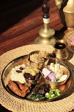 Nepali cuisine comprises a variety of cuisines based upon ethnicity, alluvial soil and climate relating to cultural diversity and geography of Nepal and neighboring regions of Sikkim and Gorkhaland. Dal-bhat-tarkari (Nepali: दाल भात तरकारी) is eaten throughout Nepal. Dal is a soup made of lentils and spices, bhat — usually rice but sometimes another grain — and a vegetable curry, tarkari. Condiments are usually small amounts of spicy pickle (achaar, अचार) which can be fresh or fermented, mainly of dried mustard greens (called gundruk ko achar) and radish (mula ko achar) and of which there are many varieties.[1] Other accompaniments may be sliced lemon (nibuwa) or lime (kagati) with fresh green chilli (hariyo khursani) and a fried papad and also Islamic food items such as rice pudding, sewai, and biryani. Dhindo (ढिंडो) is the national dish of Nepal, primarily made from flour of millet and is served with achar of gundruk 'dried spinach'. A typical example of Nepali cuisine is the Chaurasi Byanjan (Nepali: चौरासी व्यञ्जन) set where bhat (rice) is served in a giant leaf platter (patravali) along with 84 different Nepali dishes each served on small plates.[2] It is mostly fed during weddings and Pasni (rice feeding ceremony).