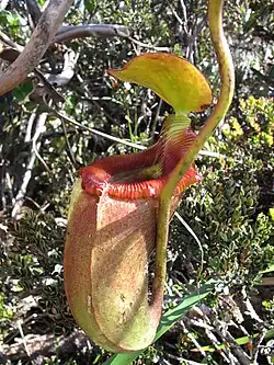 Nepenthes × kinabaluensis /nɪˈpɛnθiːz ˌkɪnəbɑːluˈɛnsɪs/, or the Kinabalu pitcher-plant,[3] is the natural hybrid between N. rajah and N. villosa.[4] It was first collected near Kambarangoh on Mount Kinabalu, Borneo by Lilian Gibbs in 1910 and later mentioned by John Muirhead Macfarlane as "Nepenthes sp." in 1914.[5] Although Macfarlane did not formally name the plant, he noted that "[a]ll available morphological details suggest that this is a hybrid between N. villosa and N. rajah".[6] It was finally described in 1976 by Shigeo Kurata as N. × kinabaluensis. The name was first published in Nepenthes of Mount Kinabalu, but was a nomen nudum at the time as it lacked an adequate description and information on the type specimen. The name was subsequently published validly by Kurata in 1984.[7]