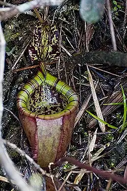 This species is endemic to the Victoria Massif in Palawan. There, it grows from 1450 m above sea level to the summit of Mount Victoria at 1726 m.[15] Originally known only from Mount Victoria itself, it has since been found on the largest peak of the Victoria Massif, Mount Sagpaw, and along the connecting ridges from the site of first collection.[15][16][17][18] The species is found among shrubs 0.8–1.8 m tall in relatively scattered populations of plants on rocky, ultramafic soil. It is not sympatric with other Nepenthes species and no natural hybrids have been recorded.[2][12]