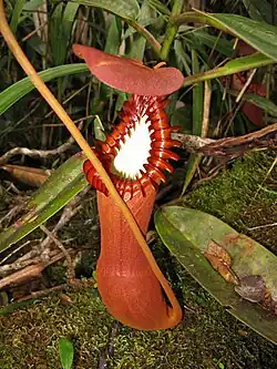 The pitcher base is bulbous to ovoid, with the pitcher cup becoming cylindrical in the upper two-thirds to three-quarters. The pitchers are some of the largest in the genus, sometimes exceeding 50 cm in height and 15 cm in width,[5] although they are usually around 30 cm high.[34] Wings at the front of the pitcher cup are either greatly reduced or absent altogether. On the inner surface of the pitcher, the glandular region is present in the bulbous portion. The mouth is elongated into a neck and has an oblique insertion. The peristome is cylindrical and up to 30 mm wide. It bears very highly developed teeth and ribs, the latter reaching 20 mm in diameter.[34] The pitcher lid or operculum is cordate, up to 8 cm wide,[27] and lacks appendages. An unbranched spur up to 20 mm long is inserted near the base of the lid.[5] Pitchers range in colour from light yellow to dark red.[34][35] The inner surface of the pitcher is usually white, contrasting sharply with the rich colouration of the outer surface. Most parts of the pitcher are very flexible, including the peristome ribs, with only the pitcher base, where the digestive zone is located, being rigid.[36][37]