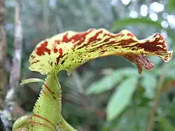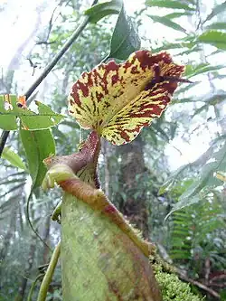 Rosette and lower pitchers are ovoid in the lower part, becoming cylindrical above. They are large, growing to 33.5 cm high by 6.8 cm wide. A pair of fringed wings (≤0.5 cm wide) runs down the ventral surface of the pitcher cup. Fringe elements are up to 1.9 cm long. The pitcher mouth is ovate and elongated into a short neck at the rear. The greatly expanded peristome may be up to 5.8 cm wide at the sides. Its inner margin is lined with distinct teeth, with those of the neck reaching 0.4 cm in length. The pitcher lid or operculum is ovate and has an unusual undulate margin. It measures up to 8.5 cm in length by 7.2 cm in width and has a cordate base. Four to five pairs of veins are visible on the upper surface of the lid. The lid bears two prominent appendages on its lower surface. The first is a hooked basal crest up to 0.7 cm long. The second is a triangular, dichotomous appendage present near the apex. This unique feature measures up to 1.4 cm in length and bears large nectar glands (0.5 to 1 mm in diameter). Smaller glands (0.1 to 0.5 mm in diameter) are concentrated along the midrib. An unbranched spur (≤2.8 cm long) is inserted near the base of the lid.[2]