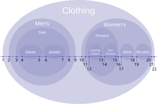 The "Clothing" category, with the highest position in the hierarchy, encompasses all subordinating categories. It is therefore given left and right domain values of 1 and 22, the latter value being the double of the total number of nodes being represented. The next hierarchical level contains "Men's" and "Women's", both containing levels within themselves that must be accounted for. Each level's data node is assigned left and right domain values according to the number of sublevels contained within, as shown in the table data.