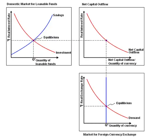 NCO is linked to the market for loanable funds and the international foreign exchange market. This relationship is often summarized by graphing the NCO curve with the quantity of country A's currency in the x-axis and the country's domestic real interest rate in the y-axis. The NCO curve gets a negative slope because an increased interest rate domestically means an incentive for savers to save more at home and less abroad.