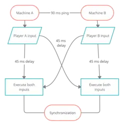 Unlike a local game where the inputs of all players are executed instantly in the same simulation or instance of the game, in an online game there are several parallel simulations (one for each player) where the inputs from their respective players are received instantly, while the inputs for the same frame from other players arrive with a certain delay (greater or lesser depending on the physical distance between the players, the quality and speed of the players' network connections, etc.).[3] During an online match, games must receive and process players' input within a certain time for each frame (roughly 17 ms per frame at 60 FPS), and if a remote player's input of a particular frame (for example, of frame number 10) arrives when another one is already running (for example, in frame number 20, roughly 170 ms later), desynchronization between player simulations is produced. There are two main resolutions to this conflict implemented in modern games: delay-based and rollback-based resolution.