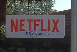 In November 2015, the Netflix logo outside the company's headquarters in Los Gatos, California had been spray-painted to add the words "and chill".[12]