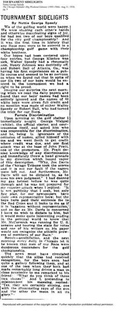 In the early 1920s, Speedy and her husband, Walter Speedy, played in Chicago-area tournaments, facing racial discrimination but persisting in their advocacy. She documented these experiences in her columns, often highlighting the obstacles that African American golfers faced.[11] In 1922, she wrote about how racial prejudice limited opportunities for African Americans in competitive golf. Despite these challenges, Speedy continued to promote the sport, eventually co-founding the Chicago Women’s Golf Club in 1937,[12] which became one of the leading Black women's social organizations in the city. In 1956, the club became a United States Golf Association (USGA) Member Club, allowing its members to compete in USGA tournaments.[13]