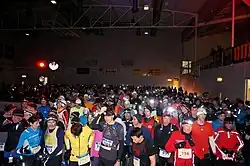 The start takes place at midnight, exactly at the beginning of the New Year. The start and finish are located in Schlieren near Zurich in Switzerland. The track consists of four laps along the river Limmat. Besides the marathon, there are also a half marathon (two laps), a quarter marathon (one 11K lap) as well as a marathon relay. The start of the marathon and the finish area of all races are located inside a sports hall. The participants run through the sports hall after each lap. The race is subject to a time limit of 5 hours, which may be extended in case of bad conditions (snow, ice).