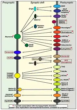 8. ^ a b c d Dean C, Dresbach T (January 2006). "Neuroligins and neurexins: linking cell adhesion, synapse formation and cognitive function". Trends in Neurosciences. 29 (1): 21–29. doi:10.1016/j.tins.2005.11.003. PMID 16337696. S2CID 11664697.