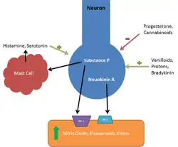 - ^ Burbach, Guido J; Kyu; Zivony, Adam S; Kim, Amy; Aranda, Jennifer; Wright, Stacey; Naik, Shubhada M; Caughman, S Wright; Ansel, John C; Armstrong, Cheryl A (2001). "The Neurosensory Tachykinins Substance P and Neurokinin A Directly Induce Keratinocyte Nerve Growth Factor". Journal of Investigative Dermatology. 117 (5): 1075–1082. doi:10.1046/j.0022-202x.2001.01498.x. PMID 11710915.