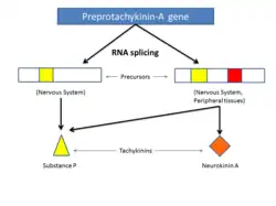 The pre-protachykinin-1 and pre-protachykinin-2 genes in mice encode four very distinct peptides with varying physiological function.[5] Alternative splicing of the pre-protachykinin-1 gene gives rise to four different peptide precursors (alphatac1, betatac1, deltatac1 und gammatac1), which are further processed into several related peptides including neurokinin A and substance P.[5] The alpha tac1 and beta tac1 precursors encode synthesis of both Substance P and neurokinin A.[5]