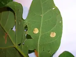 The normally cream coloured saucer of the smooth spangle gall has a small cone elevated in its centre, a pronounced rim and they are sometimes found almost folded in two.[2] The gall may have streaks of purple, red or other colours through it. Typically found on the lower surface, this gall is found more often on the upper surface than other spangle galls and although often grouped together, the numbers on each leaf are far fewer than in species such as Neuroterus quercusbaccarum. The gall is observed to swell appreciably once it has detached and fallen in late autumn. The gall has also been recorded as green, purple, red or pink.[1]
