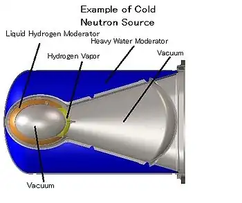 Cold neutrons are thermal neutrons that have been equilibrated in a very cold substance such as liquid deuterium. Such a cold source is placed in the moderator of a research reactor or spallation source. Cold neutrons are particularly valuable for neutron scattering experiments.[9]