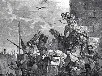 After the failed ambushes, the entire Novgorodian army organized and surrounded the fortress. and on 19 May, they assaulted Landskrona.[11][7][8] At the time, the Swedish garrison only consisted of around 13–16 healthy men, with everyone else either being dead or sick.[8] The Swedish garrison was suffering from starvation and sickness but still managed to give a strong defence against the Novgorodians. The few healthy men in the Swedish garrison, who were able to get protection from the fortresse's well-fortified places managed to keep up the battle for a long time, but this would ultimately be in vain, as they quickly succumbed to fatigue, and the Swedes quickly fell to the Novgorodian attack.[7][11]