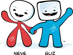 Neve and Gliz were created by Pedro Albuquerque. They both represent the characteristics of the Winter Games, including "Snow and Ice". Neve ("Snow" in Italian) is a humanized female snowball that wears red and represents "softness, friendship and elegance." Gliz (a shortened form of Ghiaccio, "Ice" in Italian) is a humanized male ice cube who wears blue and represents "enthusiasm and joy."