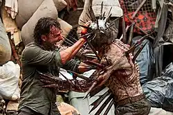 ![]() Rick fights off an armored walker named Winslow after being thrown into a trash pit by Jadis | |