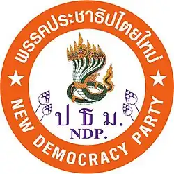 The New Democracy Party (NDP; Thai: พรรคประชาธิปไตยใหม่, Phak Prachathipataimai) is a political party in Thailand founded on 21 April 2011. Suratin Pichan is Leader and Nipon Chuenta is Deputy Leader and Jumrus Kraiyasit is Secretary-General.[4][5][6]