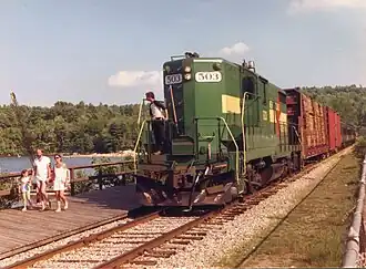 In 1985 the railroad purchased its first two non-leased locomotives, an EMD GP18, #503, and an EMD GP7, #302, from the bankrupt Chicago, Rock Island and Pacific Railroad. The locomotives were painted in a green and yellow scheme and went to work immediately.[1] 302 was originally slated to work on the B&M trackage near Worcester with access to Gardner, but that deal fell through when the Providence & Worcester Railroad objected.[1] Access to trackage between Manchester and Boscawen had bolstered the railroad's yearly carloads from 250 to nearly 2,750, much of which was due to Blue Seal Feeds at Bow Junction, and International Salt in Bow.[1] In the late 1980s the railroad was also operating a Reload on former B&M branch in Chicopee Falls, Massachusetts for Georgia Pacific, and provided rail-plant maintenance and on-site switching at the SD Warren Paper Mill in Skowhegan, Maine. NEGS also performed various maintenance-of-way contracts around New England, in MA, ME, NH and VT.[1] Less fortunate, was a proposed significant aggregate move from Columbia Falls-Centerville, Maine area, west to deep water near Bucksport, over the former Maine Central's Calais Branch of Maine DOT, which fell through. A 1988 bid on the ex-Grand Trunk line in Maine, New Hampshire and Vermont, went instead to the St. Lawrence & Atlantic Railroad.