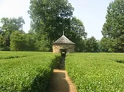 The district includes reconstructed log cabins, a potter's shop, and barns representative of early Harmonist structures.[14] The sites of early Harmonist churches, the Harmonist cemetery, and a cemetery wall built from brick used in the second Harmonist church are also part of the historic district. The cemetery, in keeping with Harmonist tradition of equality among all its members, has no gravestones within the cemetery wall. Native American mounds from the Middle Woodland Period more than two thousand years old are also found on the cemetery grounds.[15][16] Church Park includes the sites of the first (1815 to 1822) and second (1822) Harmonist churches.[17]
