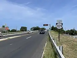 It crosses Cape Island Creek onto an island in Lower Township. Here, the route becomes maintained by the New Jersey Department of Transportation and signed as Route 109, continuing north past several marinas and other resort businesses.[1][3] The road briefly widens into a four-lane divided highway and intersects U-turn ramps in both directions before the median ends and it crosses over the Cape May Canal on the Cape May County Veterans Memorial Bridge. Upon crossing the canal, Route 109 becomes a divided highway again and intersects the southern terminus of CR 621 (Ocean Drive).[1] From here, the road passes a mix of homes and businesses before intersecting the southern terminus of the Garden State Parkway at an at-grade intersection.[3] At this point, the route turns to the west and becomes a two-lane undivided road and heads through woods and marshland with some residences. Route 109 heads into residential neighborhoods before it ends at an intersection with US 9, which continues north on the road past this intersection as well as west (south) along Sandman Boulevard toward the Cape May–Lewes Ferry terminal. At this intersection, a jughandle provides access from northbound Route 109 to southbound US 9.[1][3]