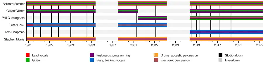 New Order are an English rock band formed in Salford in 1980 by vocalist and guitarist Bernard Sumner, bassist Peter Hook, and drummer Stephen Morris. Their fusion of post-punk and electronic dance music made them one of the most acclaimed and influential bands of the 1980s.[1] The band was formed after the disbandment of their previous band, Joy Division, following the suicide of lead singer Ian Curtis.[2] Later that year, keyboardist Gillian Gilbert joined the band. They became the flagship band for the Manchester-based independent record label Factory Records and its nightclub, The Haçienda. They worked in a long-term collaboration with graphic designer Peter Saville who worked on their album covers.[3]