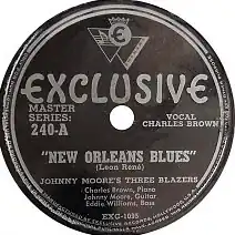 "New Orleans Blues" is a song written by Leon René and performed by Johnny Moore's Three Blazers,[1][2] consisting of Charles Brown on vocals and piano, Johnny Moore on guitar, and Eddie Williams on bass.[3][4][5] The record which was released in 1947 on the Exclusive label (catalog no. 240).[2] It debuted on Billboard magazine's race records chart on June 28, 1947, peaked at No. 2, and remained on the chart for 13 weeks.[6] It was ranked No. 11 on the Billboard's year-end list of the most played race records of 1947.[7]