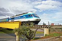 It was proposed to extend operations to Melbourne with costs to be shared with V/Line. A five-carriage promotional train ran to Melbourne on 17 February 1985, running four free return shuttles to Tullamarine Loop.[25] Crew training commenced on the North East line between Albury and Benalla in July 1985 with services scheduled to commence on 3 August, but agreement could not be reached with the Australian Federated Union of Locomotive Employees over crewing and the plan was shelved.[26][27][28] Another promotional train ran to Melbourne in November 1990.[29]