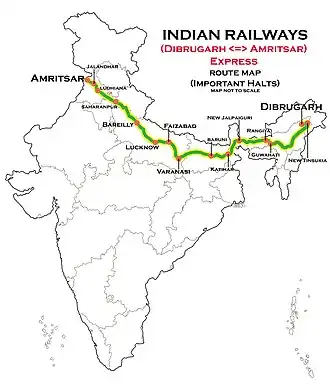 Train no. 15933, the New Tinsukia to Amritsar leaves New Tinsukia every Tuesday at 07:00 hours and reaches Amritsar every Thursday at 21:05 hours. Train no. 15934 from Amritsar to New Tinsukia leaves Amritsar every Friday at 15:45 hours and reaches New Tinsukia every Monday at 04:55 hours traveling a distance of 2853.5 kilometres in 61 hours and 10 minutes.[1]