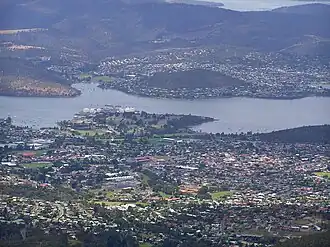 New Town viewed from Lost World to the west. New Town Bay is on the left and Cornelian Bay is on the right behind the suburb. | |||||||||||||||