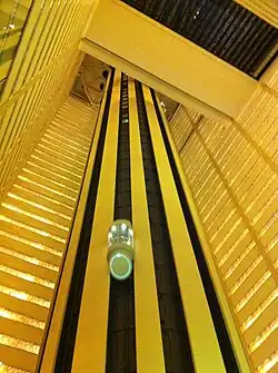 The elevator core is made of concrete and is rounded in shape,[30][37][38] with a form similar to a minaret.[39][40] It was manufactured by Collavino Brothers.[31] The core measures 55 feet (17 m) wide and carries twelve passenger elevators on its exterior, as well as four elevators at the center.[40] The exterior elevators are surrounded by glass and overlook the atrium lobby.[31] The cabs are enclosed by glass and have fiber-optic lighting.[16] The elevator system, supplied by Schindler, has a destination dispatch system, which assigns passengers to elevator cars according to their destination floors.[41][42] The destination-dispatch system was completed in 2006[41][43] and modernized in 2019.[44] Six additional elevators are used by service staff.[43][22]
