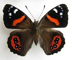 The red admiral is a medium-sized butterfly with a 50–60 mm wingspan.[1][2] The top side of the forewings is mostly black, with a central bright red bar running back from the front edge. There are white spots, fringed with light blue, near the forewing tips. The rear wings are a dark reddish brown with a red patch containing four black circles; the centre of each circle is pale blue.