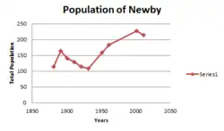 The population of Newby has fluctuated between 109 and 214 people between 1881 and 2011. The population of Newby in the 20th Century hit a peak of 183 in 1961.[6] The population of Newby in 2011 is 214 and covers a wide range of age groups.