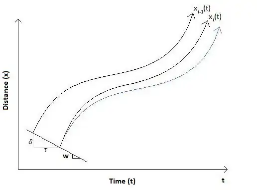 Thus, τ and δ are constants defined by the wave speed and jam density, independent of the speed of the leading vehicle and the traffic state. The path of vehicle i, a function of time, can be determined using the equation: