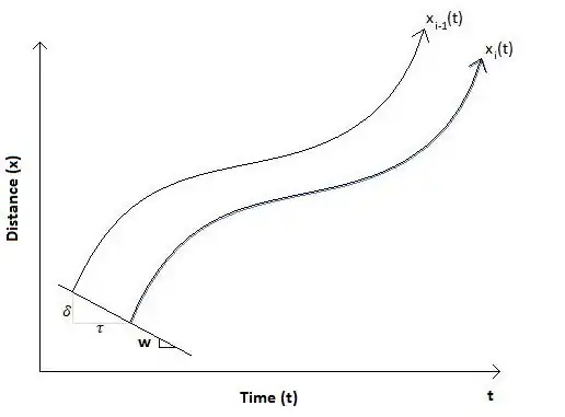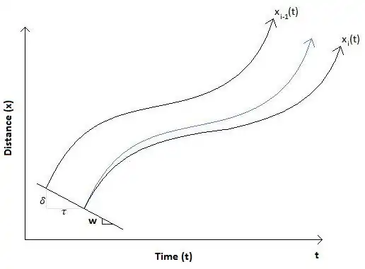 In the time-space diagram, the trajectories of the leading (top) and following (bottom) vehicle are separated by the distance δ and time τ. The spacing between vehicles at traffic state A can be found using a geometric relationship found in the time-space diagram: