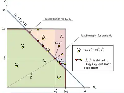 Solving the model can be done graphically, where the four possible states of the system are visible on a plot of the two inlet flows, and boundaries defined by the relationships in the model.[5] The feasible region for q1 and q2 is bounded by the relationships that the flow in inlet 1 cannot be greater than μ1 and similarly for inlet 2, and the relationship of q1 + q2 = μ. All solutions must be within this region, bounded in red in the figure. A second boundary is the feasible region for demands, the maximum possible values for q1D and q2D, defined to be μ1 and μ2, and is bounded by black in the figure. The split priority, p, is plotted from the origin to the line q1 + q2 = μ.