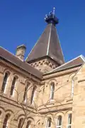 Expanding student numbers meant that more extensive premises closer to the city were required. A bequest by John Jones of land at Stanmore saw the College move to the newly fashionable inner-city suburbs. A grand stone edifice was designed by Thomas Rowe and was described by Morton Herman, an architectural historian, as 'an almost perfect example of scholastic Gothic Revival architecture'.[16] The Thomas Rowe-designed Founder's Building, including its interior and surrounding grounds, are listed on the heritage register of the former Marrickville Council.[17] Thomas Wran completed substantial architectural sculpture commissions on the capitals of the stone colonnade of the building.[18] Earth-moving work began on the site in 1876 and by May 1878 the building had reached first floor height. A public ceremony was held and six commemorative stones were laid. Among the six given the honour of laying the stones were Sir George Wigram Allen KCMG,[19] the philanthropist who was Speaker of the New South Wales Legislative Assembly. He had lent A£12,000 for the new buildings at Stanmore and later endowed the Wigram Allen Scholarship for boys proceeding to matriculation. The formal opening of the new school building was by Sir George on 18 January 1881. By resolution of the College Council, the name Newington College was perpetuated on the new site. Seventy school and theological students migrated from Silverwater to Stanmore.[20]