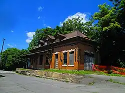 In 1849 the Pennsylvania Railroad had laid tracks through Third Street downtown. The PRR purchased the struggling canal in 1857, but kept the waterways open until 1889 when the Johnstown Flood demolished it. By 1905, the PRR began construction of a new trackline along the former towpath which remains today.[6] There was a small freight yard where railcars and cargo could be transferred to standard gauge, and in 1890 Newport was the eastern end of the Newport and Shermans Valley Railroad.