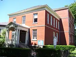 Ground was broken in 1902 for a brick library building at 82 Touro Street, which would be attached to the Sabbatarian Meeting House (previously acquired from Seventh Day Baptists by the society). The new building provided office space for the society, a fireproof vault for historic documents, and a library. In 1915, the meeting house was detached from the library and moved to the rear of the lot. A three-story brick building was constructed between the library and the meeting house. Brick veneer, a slate roof, and steel shutters were added to the exterior of the meeting house to make its exterior covering consistent with the adjoining structures, and to provide added protection from the weather and the threat of fire.[1]