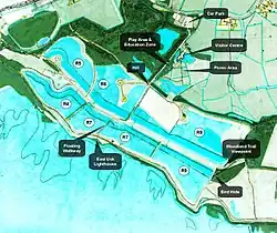 The reserve contains an artificial floating walkway, which provides a direct route to the lighthouse over lagoon R7. This lagoon is one of three lagoons spanning the coastal path (east to west). The most easterly lagoon (R9) is overlooked by a bird hide in addition to being viewable from a fenced overpass, and the most westerly lagoon (R4) is viewable from a fenced overpass.
