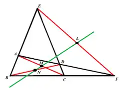 It is a well-known theorem that the three midpoints of the diagonals of a complete quadrilateral are collinear.[2] There are several proofs of the result based on areas [2] or wedge products[3] or, as the following proof, on Menelaus's theorem, due to Hillyer and published in 1920.[4]