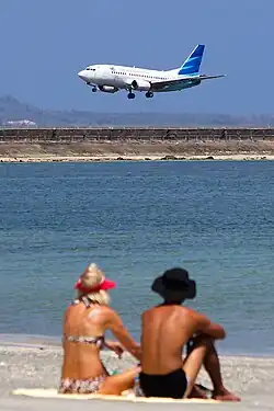 I Gusti Ngurah Rai International Airport (IATA: DPS, ICAO: WADD), also known as Denpasar International Airport and Bali Airport, is the main international airport of Bali, Indonesia. Located 13 kilometres (8.1 mi) from Downtown Denpasar, it serves the Denpasar metropolitan area and the whole island of Bali. Ngurah Rai is the second busiest airport in Indonesia after Soekarno-Hatta. Ngurah Rai is one of the most popular island destinations hubs in Asia. In 2018, the airport served 23,779,178 passengers.[1] The new upgrades of Ngurah Rai have increased the popularity of Bali and made it one of the best airports in Asia and more known worldwide. The airport has category IX and is capable of serving wide-body aircraft including the Boeing 747-8 and Airbus A380.[2]