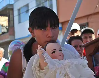 The traditions surrounding the image have not changed much in the over 400 years even though Xochimilco has transformed from a rural area to an urban one.[1] As it is associated with popular religious expression and because of this, it does not reside in a church but rather with a family.[1][4] It is part of popular religious expression and not official Church doctrine. Because of this, the image does not reside in a church but rather in the home of a family. He is “laid down to sleep” each night in a basket made for him, in his underclothes and wrapped in a blanket. Each morning, he is “awoken” to Las Mañanitas before he is dressed.[1] Each evening it attends Mass before heading back to the home of the mayordomo.[4] Since 1995, the image has been taken once a year for a “check up” with the “pediatrician,” which is annual examination, including X-ray and maintenance work done by INAH.[2] The image is hosted by a sponsor or “mayordomo” each year in the family home, often in a room built especially for the purpose. This area is open to the public with all free to come and go.[1][2] It is believed that those who become a mayordomo of the image receive blessings and prosperity.[3] The waiting list to host the image extends past 2040 and families have waited as much as fifty years.[2][7] If the person on the waiting list dies beforehand, the privilege is inherited by another member of the family.[3] Families who have hosted the image receive a life-sized copy.[7]