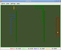 Nibbles was included with MS-DOS version 5.0 and above. Written in QBasic, it is one of the programs included as a demonstration of that programming language.[1] The QBasic game uses the standard 80x25 text screen to emulate an 80x50 grid by making clever use of foreground and background colors, and the ANSI characters for full blocks and half-height blocks. Microsoft's 24kB QBasic version was copyrighted in 1990. Due to MS-DOS's prevalence at the time, it was available on almost every IBM PC compatible in the early 1990s.