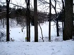 A deep ravine, leading down from Forest Hill Cemetery to the Huron River, was left undeveloped as the surrounding land was converted to farmland in the 19th century. By the 1850s, the ravine was referred to as "Schoolgirls' Glen," likely for the pupils of a girls' school who gathered flowers there. Schoolgirls' Glen became popular as a retreat for university students, due to its location close to campus. The glen's beauty inspired an 1875 anonymous opinion piece in a student newspaper, which read in part that “no person with any poetry in his soul can walk from the second railroad bridge north to Schoolgirls’ Glen without rhyming all the way.”[6][7]