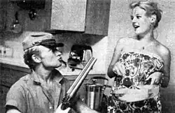 Adams initially may have met James Dean in December 1950 while jitterbugging for a soft drink commercial filmed at Griffith Park.[6] Adams spent three years in the Coast Guard between the time this commercial was shot in late 1950 and the start of filming for Rebel Without a Cause in March 1955. Actor Jack Grinnage, who played Moose, recalled, "Off the set, Nick, Dennis (Hopper), and the others would go out together — almost like the gang we portrayed — but Jimmy and Corey Allen ... were not a part of that."[7] When production was wrapped, Dean said in another press release, "I now regard Natalie (Wood), Nick, and Sal (Mineo) as co-workers; I regard them as friends ... about the only friends I have in this town. And I hope we all work together again soon."[8] Following Dean's 1955 death in an automobile accident, Adams overdubbed some of Dean's lines for the film Giant (these are in Jett Rink's speech at the hotel) and dated co-star Natalie Wood. Adams tried to capitalize on Dean's fame through various publicity stunts, including a claim he was being stalked by a crazed female Dean fan, allowing himself to be photographed at Dean's grave in a contemplative pose, holding flowers, and surrounded by mourning, teenaged female fans along with writing articles and doing interviews about Dean for fan magazines.[9][10][11] He also claimed to have developed Dean's affection for fast cars, later telling a reporter, "I became a highway delinquent. I was arrested nine times in one year. They put me on probation, but I kept on racing ... nowhere."