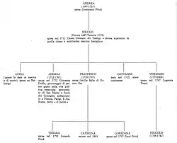 He was born in 1685 in Padua from a noble Venetian family, descending from the homonym doge of Venice who had lived two centuries before. He attended the Nobles’ board of Parma and when he was young he began his political career as a Savio agli Ordini, the first senatorial rule which a young patrician could aspire. In 1711 Nicolò married Chiara Grimani of Francesco, one of the most beautiful ladies of the time according to contemporaries. Within a year, at 3 October 1712, she gave him his first-born son Andrea, who in turn would begin a brilliant political career, becoming the so-called "paròn del Senato" ("Master of the Senate").