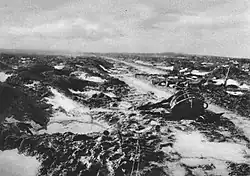 The 33rd Division was relieved by the 50th Division on 13 December and the area to the east and south of Passchendaele was held by posts, those to the east being fairly habitable, unlike the southern ones; from Passchendaele as far back as Potijze, the ground was far worse. Each brigade spent four days in the front line, four in support and four in reserve; on 18 December, thirteen Germans with four machine-guns were captured, having got lost in no man's land. The area was quiet apart from artillery-fire and the 50th Division was relieved by the 33rd Division from 4–6 January 1918, then came back into the line from 29 January. From 25–27 December, the 8th Division relieved of the 14th (Light) Division in cold and snowy weather, which entailed a great effort to prevent trench foot. In January, spells of freezing cold were followed by warmer periods, one beginning on 15 January with torrential rain and gale force winds, washing away plank roads and duckboard tracks.[44] Conditions in the salient improved with the completion of transport routes and the refurbishment of German pillboxes. The Germans continued to raiding the British lines, often from a position known as the gasometers and also from Passchendaele railway station. The British retaliated and used night machine-gun fire and artillery barrages to great effect.[45]