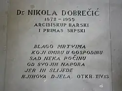 Nikola Dobrečić (Serbian Cyrillic: Никола Добречић; 28 January 1872 – 14 November 1955) was a Roman Catholic priest, Archbishop of Bar and Primate of Serbia, restorer of the Roman Catholic Church in Montenegro, reformer, poet, philanthropist, theologian and philosopher, founder of the archbishop's residence in Bar.