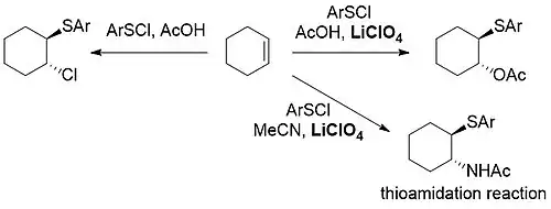 Zefirov made significant contributions to the understanding of Electrophilic addition reactions by establishing the ion-pair mechanism using the example of Thiirane cations. In 1974 he discovered the phenomenon of increasing the effective electrophilicity of weak electrophiles, which was called "Doping-addition". Such effect occurs for weak electrophiles, increasing electrophilicity and making them reactive enough for electrophilic addition.[5] Additionally Zefirov has developed thioacylation and thioamidation reactions in the presence of lithium perchlorate.[6] The proposed reaction pathway includes onium ion formation with the following perchlorate ion addition. The “doping effect” can also be observed in more complex cases, such as induction of the skeletal rearrangement reaction in bicyclic compounds.[7][8] Zefirov is also known for the work on the stereocontrol in reactions proceeding through the ion-pair mechanism.