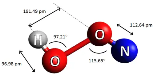 Nitrosyl-O-hydroxide (molecular formula HOON) is an isomer of nitrous acid, which has been experimentally observed in the gas phase.[2] HOON contains the longest oxygen-oxygen bond thus far observed in any known molecule, measured to be 1.9149 angstroms. There had been speculation about the existence of this molecule, and ab initio calculations have suggested that it might have a stable chemically bonded structure.[3]